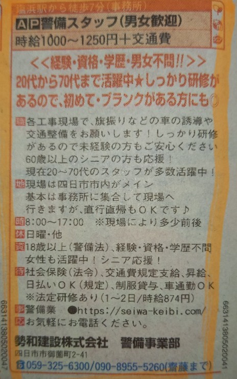 そして当社、勢和警備はタウンワークにて本日より求人の掲載が決まりました☺️